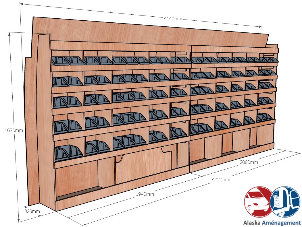 Ce meuble de rangement KRG001-N (pour le latéral « Gauche » de votre véhicule) offre une solution de stockage polyvalente et fonctionnelle avec sept niveaux de stockage. Il comprend des étagères pour bacs à bec pour ranger toutes vos petites pièces. Une étagère supérieure est conçue pour les objets longs. Son fond arrière intégré assure la rigidité et protège la carrosserie du véhicule, évitant un habillage supplémentaire. Le meuble est disponible en contreplaqué brut ou filmé. |