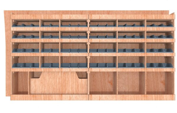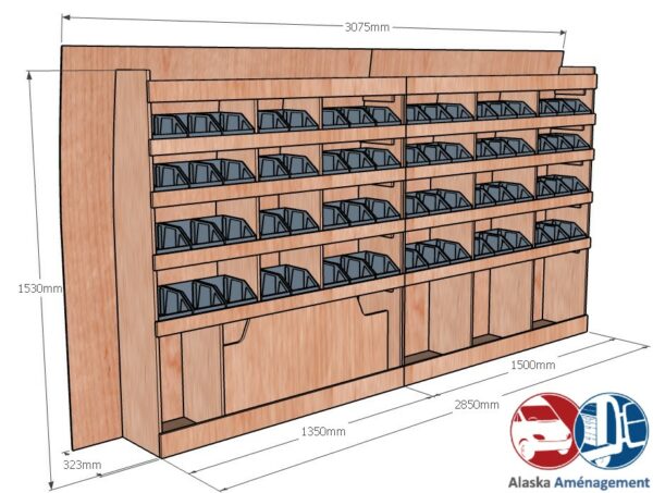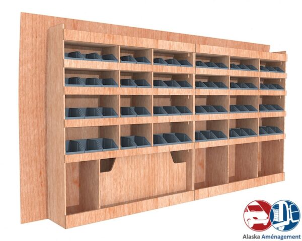 Ce meuble de rangement KRG001-N (pour le latéral « Gauche » de votre véhicule) offre une solution de stockage polyvalente et fonctionnelle avec six niveaux de stockage. Il comprend des étagères pour bacs à bec pour ranger toutes vos petites pièces. Une étagère supérieure est conçue pour les objets longs. Son fond arrière intégré assure la rigidité et protège la carrosserie du véhicule, évitant un habillage supplémentaire. Le meuble est disponible en contreplaqué brut ou filmé. |