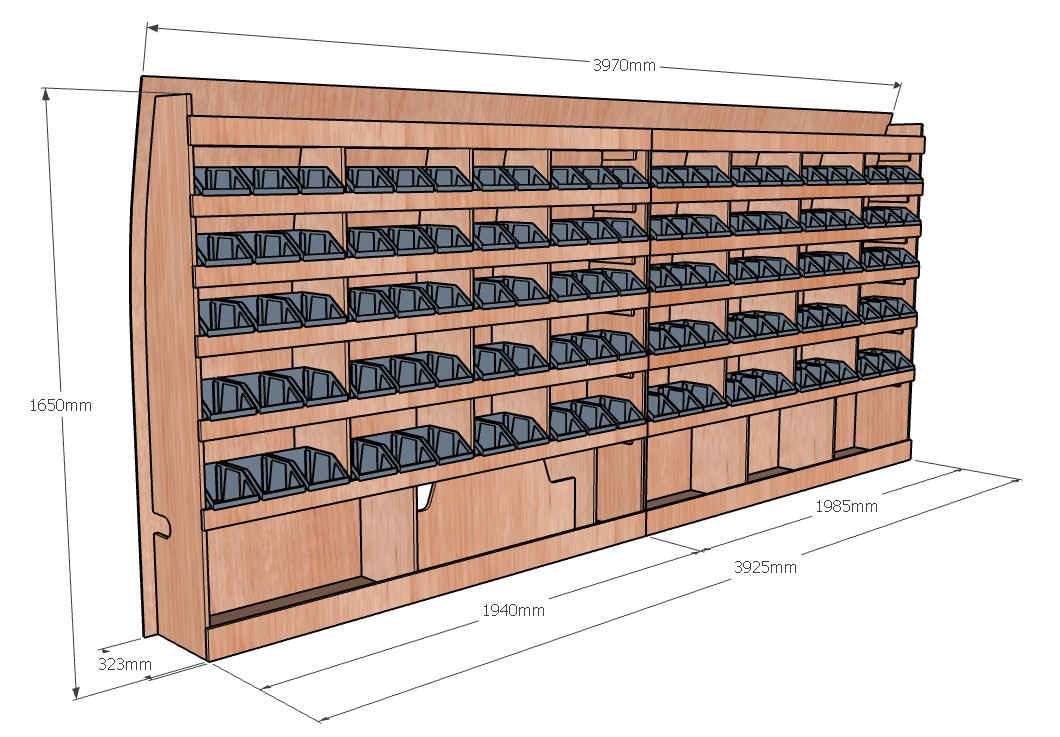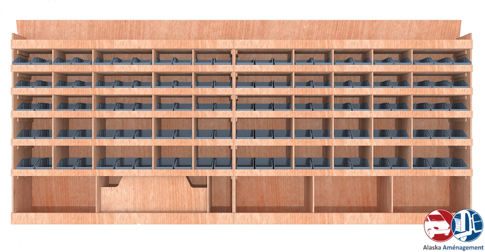 Ce meuble de rangement KRG001-N (pour le latéral « Gauche » de votre véhicule) offre une solution de stockage polyvalente et fonctionnelle avec sept niveaux de stockage. Il comprend des étagères pour bacs à bec pour ranger toutes vos petites pièces. Une étagère supérieure est conçue pour les objets longs. Son fond arrière intégré assure la rigidité et protège la carrosserie du véhicule, évitant un habillage supplémentaire. Le meuble est disponible en contreplaqué brut ou filmé. |