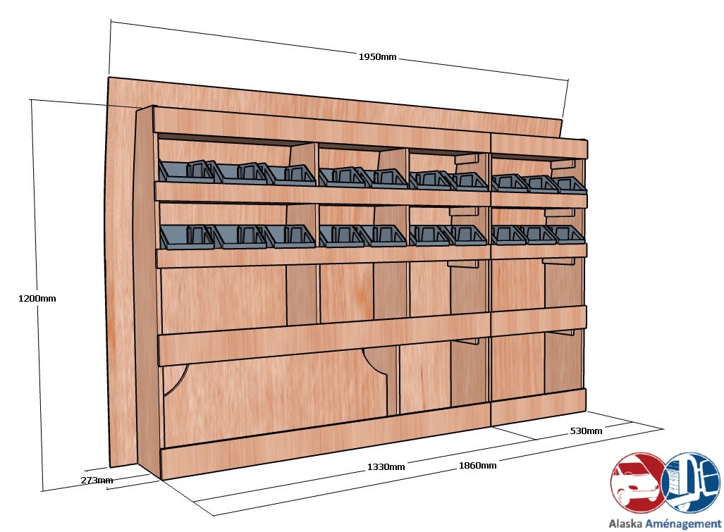 Ce meuble de rangement KRG001-N (pour le latéral « Gauche » de votre véhicule) offre une solution de stockage polyvalente et fonctionnelle avec cinq niveaux de stockage. Il comprend des étagères pour bacs à bec pour ranger toutes vos petites pièces. Une étagère supérieure est conçue pour les objets longs. Son fond arrière intégré assure la rigidité et protège la carrosserie du véhicule, évitant un habillage supplémentaire. Le meuble est disponible en contreplaqué brut ou filmé.