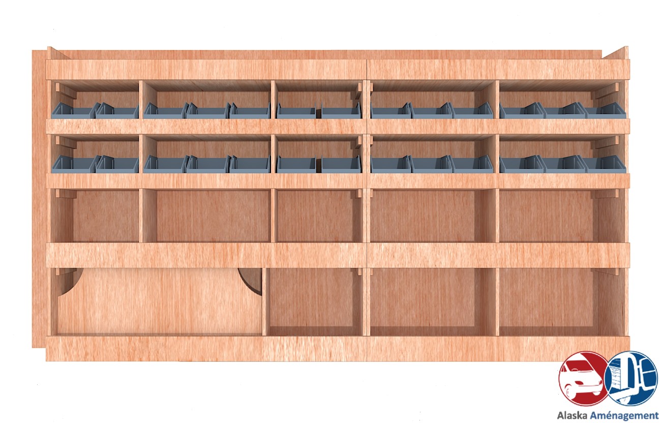 Ce meuble de rangement KRG001-N (pour le latéral « Gauche » de votre véhicule) offre une solution de stockage polyvalente et fonctionnelle avec cinq niveaux de stockage. Il comprend des étagères pour bacs à bec pour ranger toutes vos petites pièces. Une étagère supérieure est conçue pour les objets longs. Son fond arrière intégré assure la rigidité et protège la carrosserie du véhicule, évitant un habillage supplémentaire. Le meuble est disponible en contreplaqué brut ou filmé. |