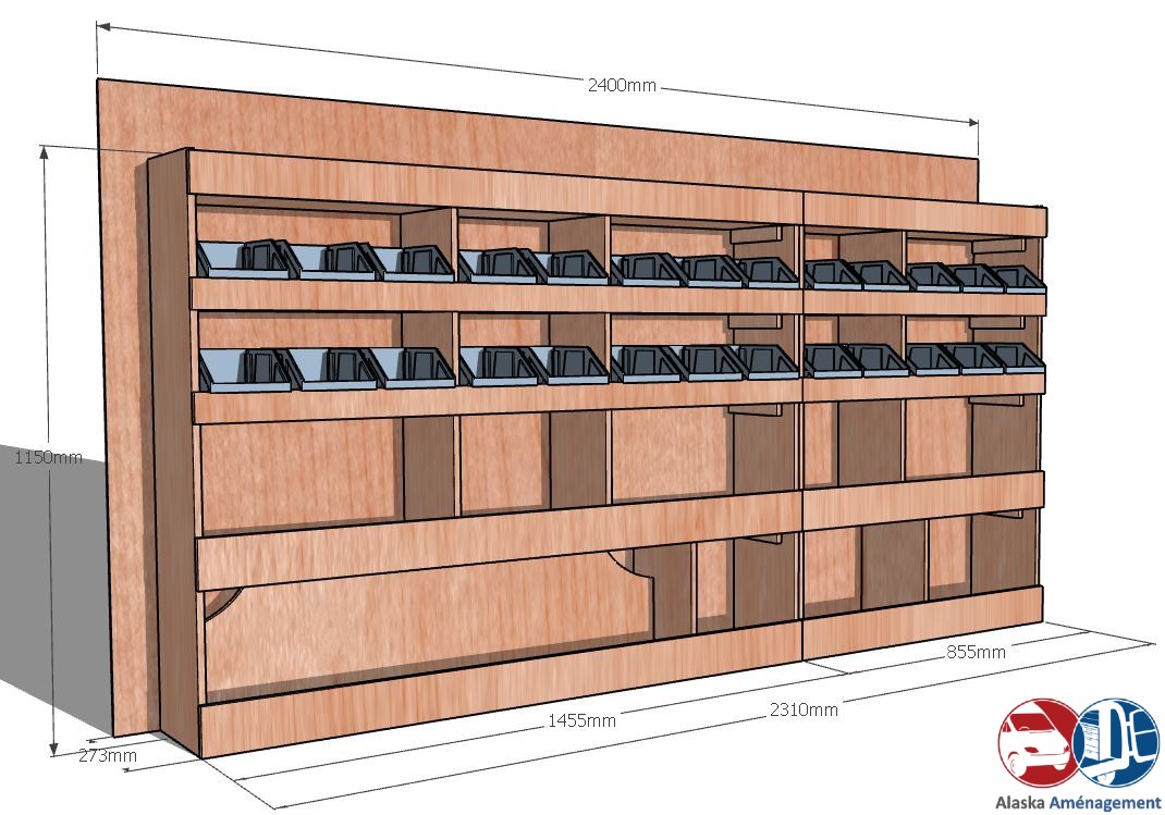Ce meuble de rangement KRG001-N (pour le latéral « Gauche » de votre véhicule) offre une solution de stockage polyvalente et fonctionnelle avec cinq niveaux de stockage. Il comprend des étagères pour bacs à bec pour ranger toutes vos petites pièces. Une étagère supérieure est conçue pour les objets longs. Son fond arrière intégré assure la rigidité et protège la carrosserie du véhicule, évitant un habillage supplémentaire. Le meuble est disponible en contreplaqué brut ou filmé.