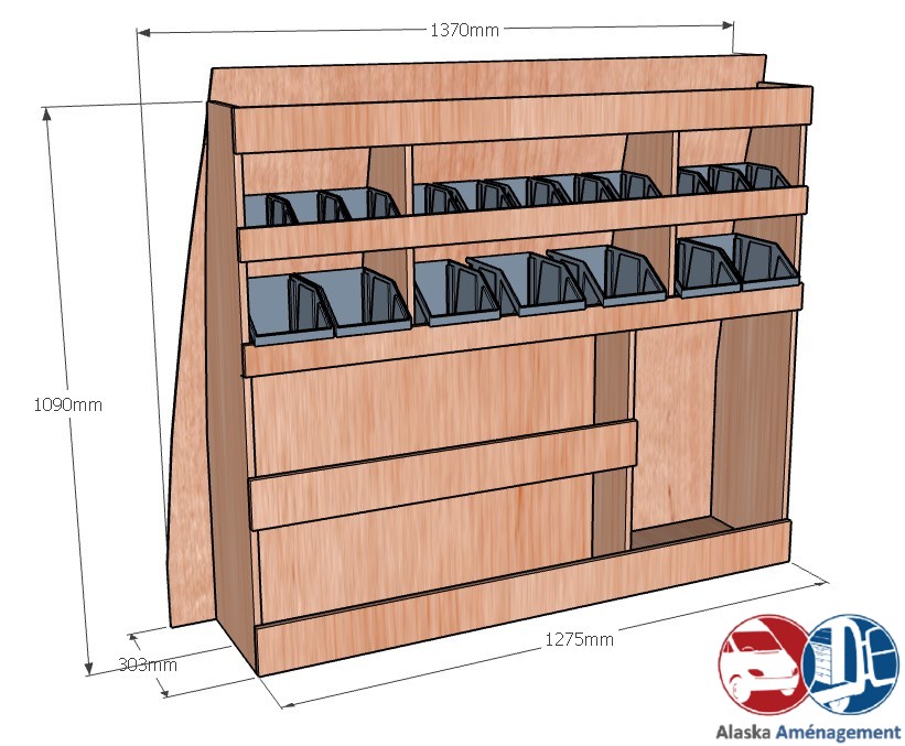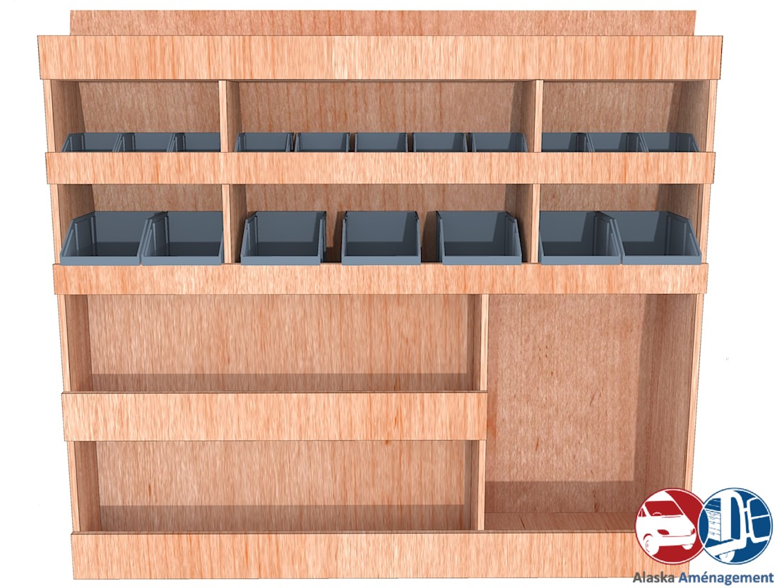 Ce meuble de rangement KRG001-N (pour le latéral « Gauche » de votre véhicule) offre une solution de stockage polyvalente et fonctionnelle avec cinq niveaux de stockage. Il comprend des étagères pour bacs à bec pour ranger toutes vos petites pièces. Une étagère supérieure est conçue pour les objets longs. Son fond arrière intégré assure la rigidité et protège la carrosserie du véhicule, évitant un habillage supplémentaire. Le meuble est disponible en contreplaqué brut ou filmé.