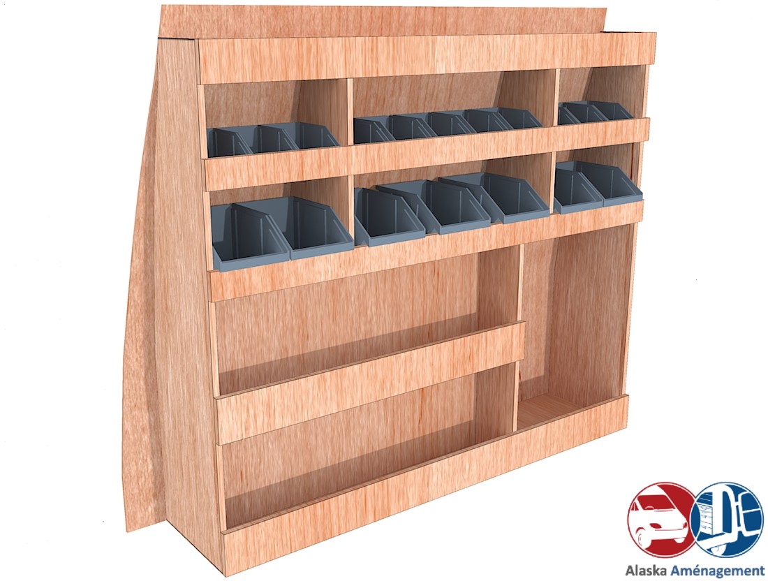 Ce meuble de rangement KRG001-N (pour le latéral « Gauche » de votre véhicule) offre une solution de stockage polyvalente et fonctionnelle avec cinq niveaux de stockage. Il comprend des étagères pour bacs à bec pour ranger toutes vos petites pièces. Une étagère supérieure est conçue pour les objets longs. Son fond arrière intégré assure la rigidité et protège la carrosserie du véhicule, évitant un habillage supplémentaire. Le meuble est disponible en contreplaqué brut ou filmé.