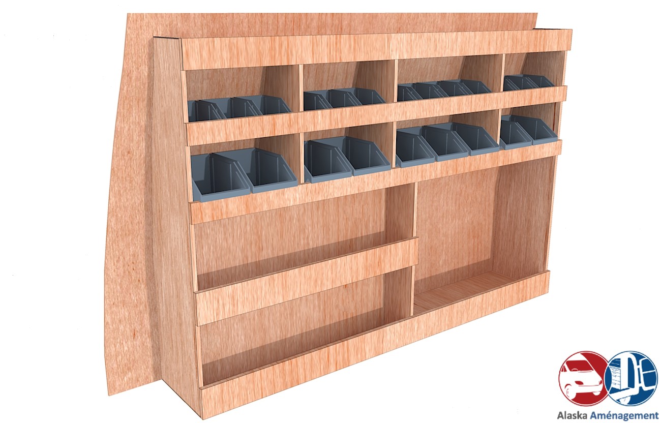 Ce meuble de rangement KRG001-N (pour le latéral « Gauche » de votre véhicule) offre une solution de stockage polyvalente et fonctionnelle avec cinq niveaux de stockage. Il comprend des étagères pour bacs à bec pour ranger toutes vos petites pièces. Une étagère supérieure est conçue pour les objets longs. Son fond arrière intégré assure la rigidité et protège la carrosserie du véhicule, évitant un habillage supplémentaire. Le meuble est disponible en contreplaqué brut ou filmé.
