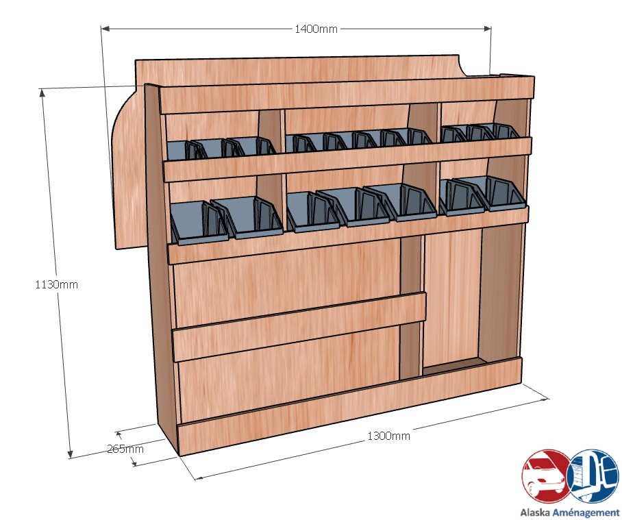 Ce meuble de rangement KRG001-N (pour le latéral « Gauche » de votre véhicule) offre une solution de stockage polyvalente et fonctionnelle avec cinq niveaux de stockage. Il comprend des étagères pour bacs à bec pour ranger toutes vos petites pièces. Une étagère supérieure est conçue pour les objets longs. Son fond arrière intégré assure la rigidité et protège la carrosserie du véhicule, évitant un habillage supplémentaire. Le meuble est disponible en contreplaqué brut ou filmé.