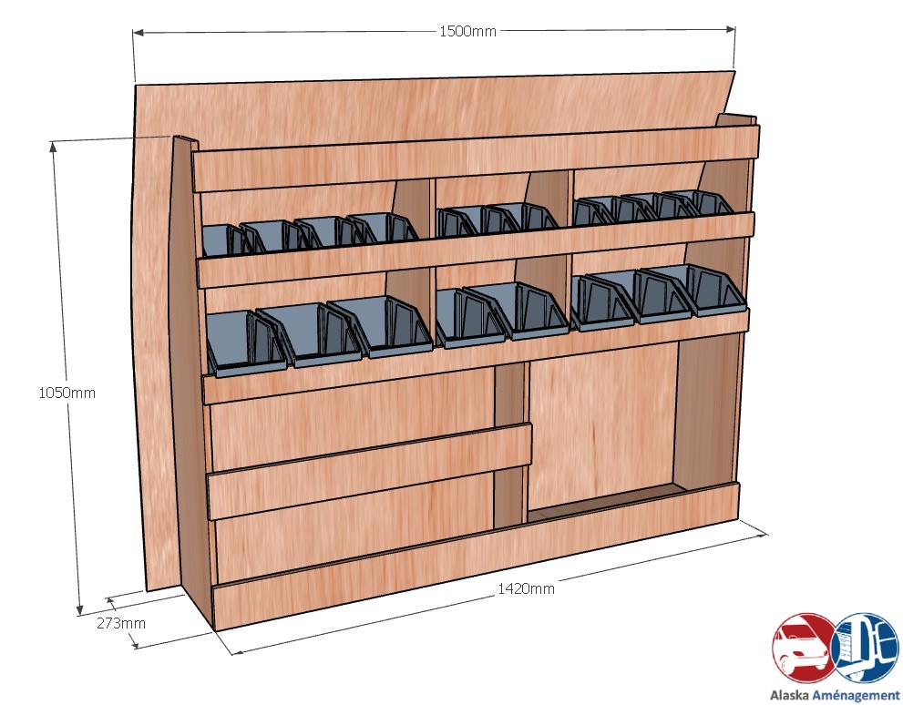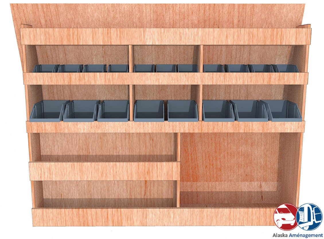 Ce meuble de rangement KRG001-N (pour le latéral « Gauche » de votre véhicule) offre une solution de stockage polyvalente et fonctionnelle avec cinq niveaux de stockage. Il comprend des étagères pour bacs à bec pour ranger toutes vos petites pièces. Une étagère supérieure est conçue pour les objets longs. Son fond arrière intégré assure la rigidité et protège la carrosserie du véhicule, évitant un habillage supplémentaire. Le meuble est disponible en contreplaqué brut ou filmé.