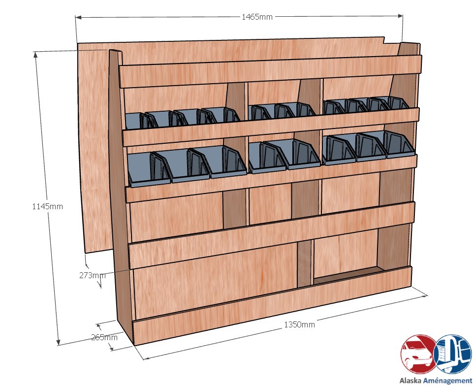 Ce meuble de rangement KRG001-N (pour le latéral « Gauche » de votre véhicule) offre une solution de stockage polyvalente et fonctionnelle avec cinq niveaux de stockage. Il comprend des étagères pour bacs à bec pour ranger toutes vos petites pièces. Une étagère supérieure est conçue pour les objets longs. Son fond arrière intégré assure la rigidité et protège la carrosserie du véhicule, évitant un habillage supplémentaire. Le meuble est disponible en contreplaqué brut ou filmé.