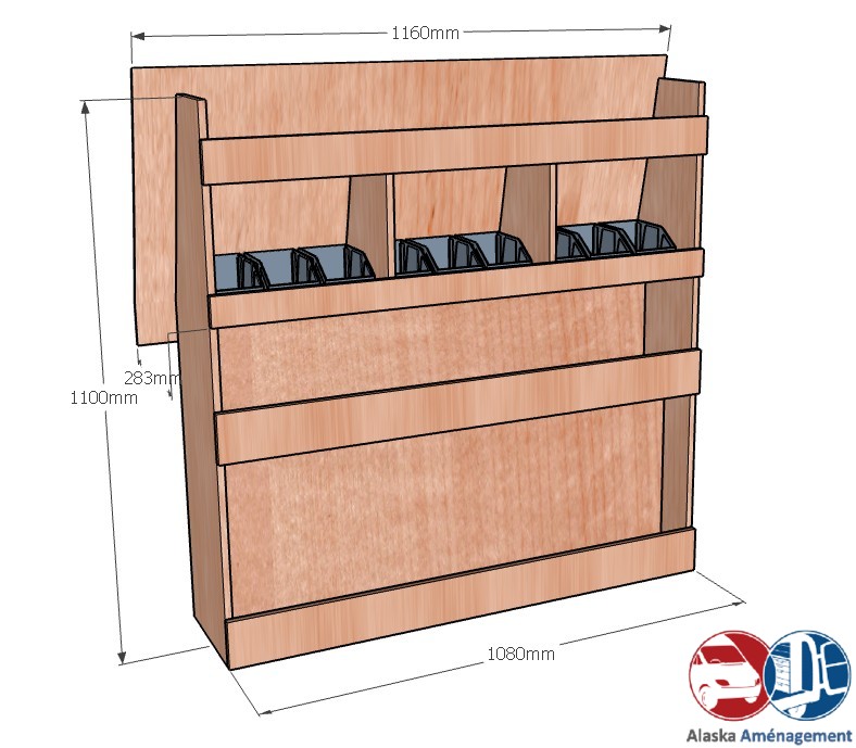 Ce meuble de rangement KRG001-N (pour le latéral « Gauche » de votre véhicule) offre une solution de stockage polyvalente et fonctionnelle avec cinq niveaux de stockage. Il comprend des étagères pour bacs à bec pour ranger toutes vos petites pièces. Une étagère supérieure est conçue pour les objets longs. Son fond arrière intégré assure la rigidité et protège la carrosserie du véhicule, évitant un habillage supplémentaire. Le meuble est disponible en contreplaqué brut ou filmé.