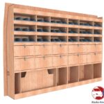 Meuble avec clapets et bacs à bec, pour des artisans organisés.
