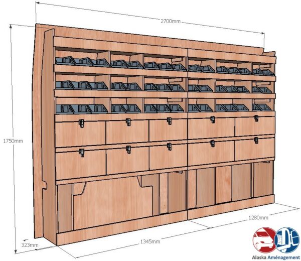 Ce meuble de rangement KRG002-N (pour le latéral « Gauche » de votre véhicule) offre une solution de stockage polyvalente et fonctionnelle avec sept niveaux de stockage. Il comprend des étagères pour bacs à bec et des clapets basculants. Une étagère supérieure est conçue pour les objets longs. Son fond arrière intégré assure la rigidité et protège la carrosserie du véhicule, évitant un habillage supplémentaire. Le meuble est disponible en contreplaqué brut ou filmé.