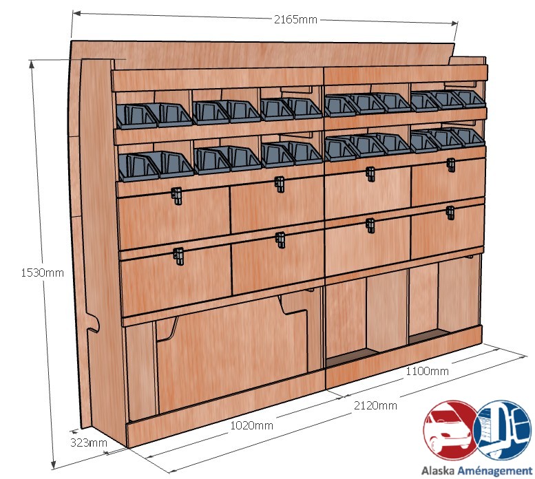Ce meuble de rangement KRG002-N (pour le latéral « Gauche » de votre véhicule) offre une solution de stockage polyvalente et fonctionnelle avec six niveaux de stockage. Il comprend des étagères pour bacs à bec et des clapets basculants. Une étagère supérieure est conçue pour les objets longs. Son fond arrière intégré assure la rigidité et protège la carrosserie du véhicule, évitant un habillage supplémentaire. Le meuble est disponible en contreplaqué brut ou filmé. |