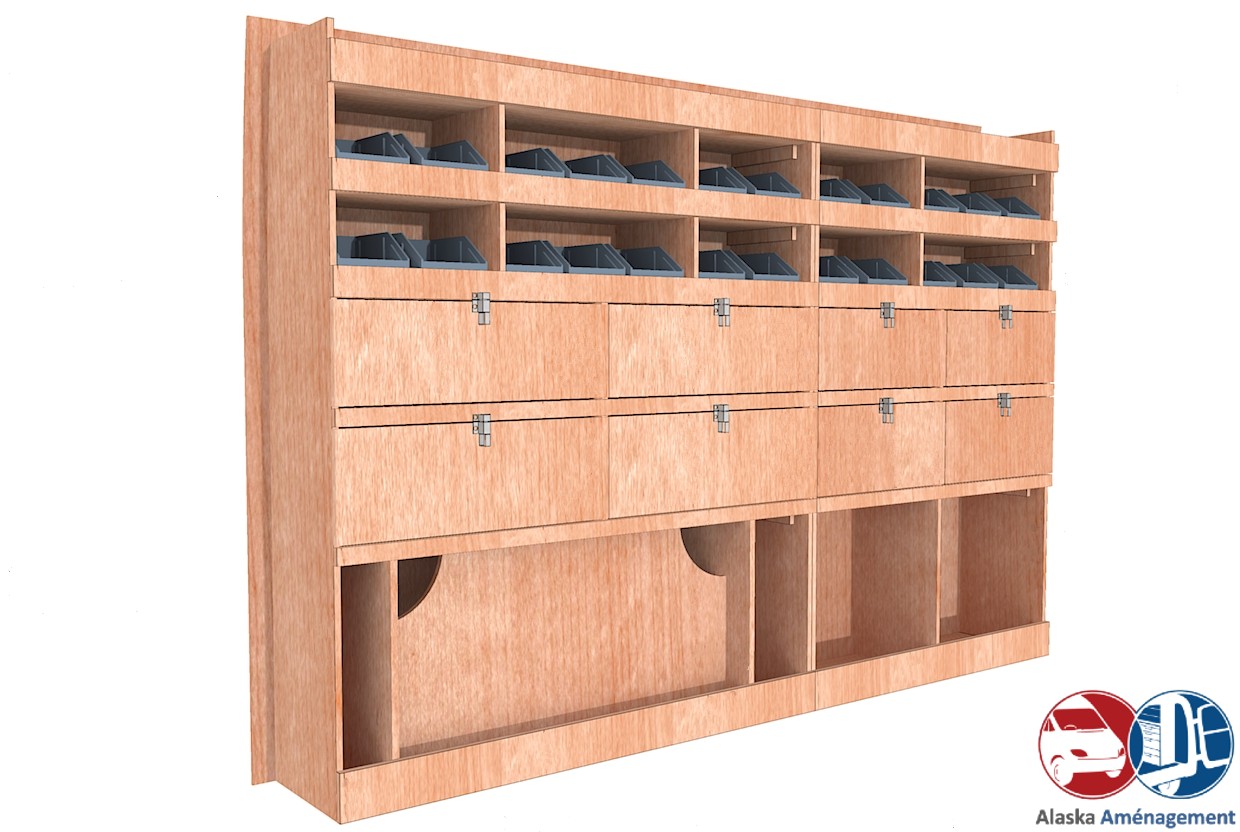 Ce meuble de rangement KRG002-N (pour le latéral « Gauche » de votre véhicule) offre une solution de stockage polyvalente et fonctionnelle avec six niveaux de stockage. Il comprend des étagères pour bacs à bec et des clapets basculants. Une étagère supérieure est conçue pour les objets longs. Son fond arrière intégré assure la rigidité et protège la carrosserie du véhicule, évitant un habillage supplémentaire. Le meuble est disponible en contreplaqué brut ou filmé. |