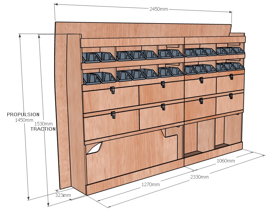 Ce meuble de rangement KRG002-N (pour le latéral « Gauche » de votre véhicule) offre une solution de stockage polyvalente et fonctionnelle avec six niveaux de stockage. Il comprend des étagères pour bacs à bec et des clapets basculants. Une étagère supérieure est conçue pour les objets longs. Son fond arrière intégré assure la rigidité et protège la carrosserie du véhicule, évitant un habillage supplémentaire. Le meuble est disponible en contreplaqué brut ou filmé. |