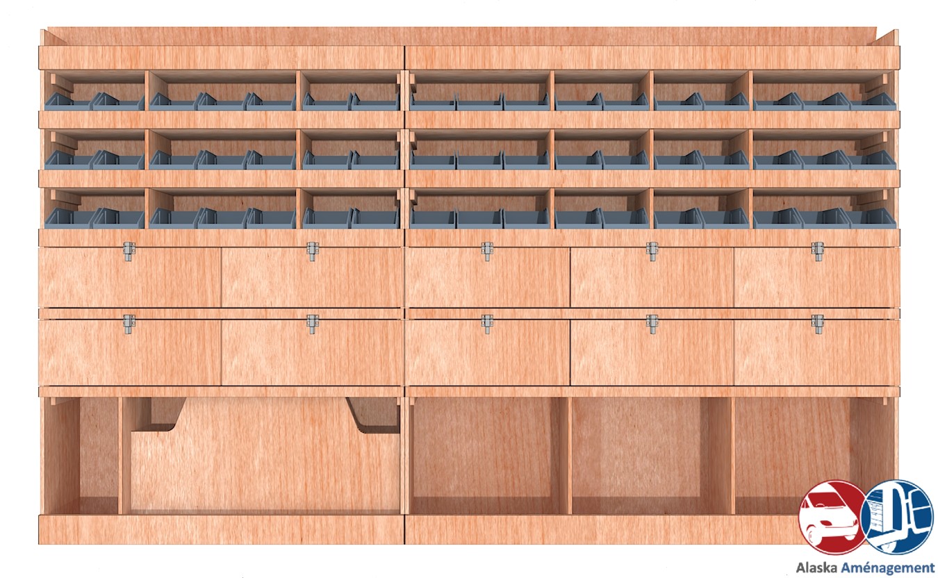 Ce meuble de rangement KRG002-N (pour le latéral « Gauche » de votre véhicule) offre une solution de stockage polyvalente et fonctionnelle avec sept niveaux de stockage. Il comprend des étagères pour bacs à bec et des clapets basculants. Une étagère supérieure est conçue pour les objets longs. Son fond arrière intégré assure la rigidité et protège la carrosserie du véhicule, évitant un habillage supplémentaire. Le meuble est disponible en contreplaqué brut ou filmé. |