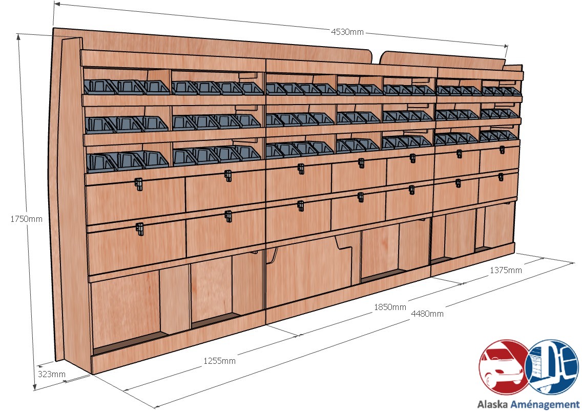 Ce meuble de rangement KRG002-N (pour le latéral « Gauche » de votre véhicule) offre une solution de stockage polyvalente et fonctionnelle avec sept niveaux de stockage. Il comprend des étagères pour bacs à bec et des clapets basculants. Une étagère supérieure est conçue pour les objets longs. Son fond arrière intégré assure la rigidité et protège la carrosserie du véhicule, évitant un habillage supplémentaire. Le meuble est disponible en contreplaqué brut ou filmé. |