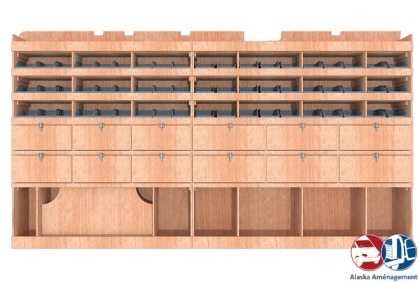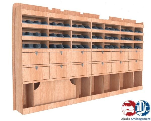 Ce meuble de rangement KRG002-N (pour le latéral « Gauche » de votre véhicule) offre une solution de stockage polyvalente et fonctionnelle avec sept niveaux de stockage. Il comprend des étagères pour bacs à bec et des clapets basculants. Une étagère supérieure est conçue pour les objets longs. Son fond arrière intégré assure la rigidité et protège la carrosserie du véhicule, évitant un habillage supplémentaire. Le meuble est disponible en contreplaqué brut ou filmé. |