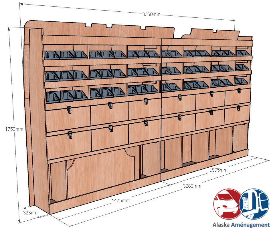 Ce meuble de rangement KRG002-N (pour le latéral « Gauche » de votre véhicule) offre une solution de stockage polyvalente et fonctionnelle avec sept niveaux de stockage. Il comprend des étagères pour bacs à bec et des clapets basculants. Une étagère supérieure est conçue pour les objets longs. Son fond arrière intégré assure la rigidité et protège la carrosserie du véhicule, évitant un habillage supplémentaire. Le meuble est disponible en contreplaqué brut ou filmé. |