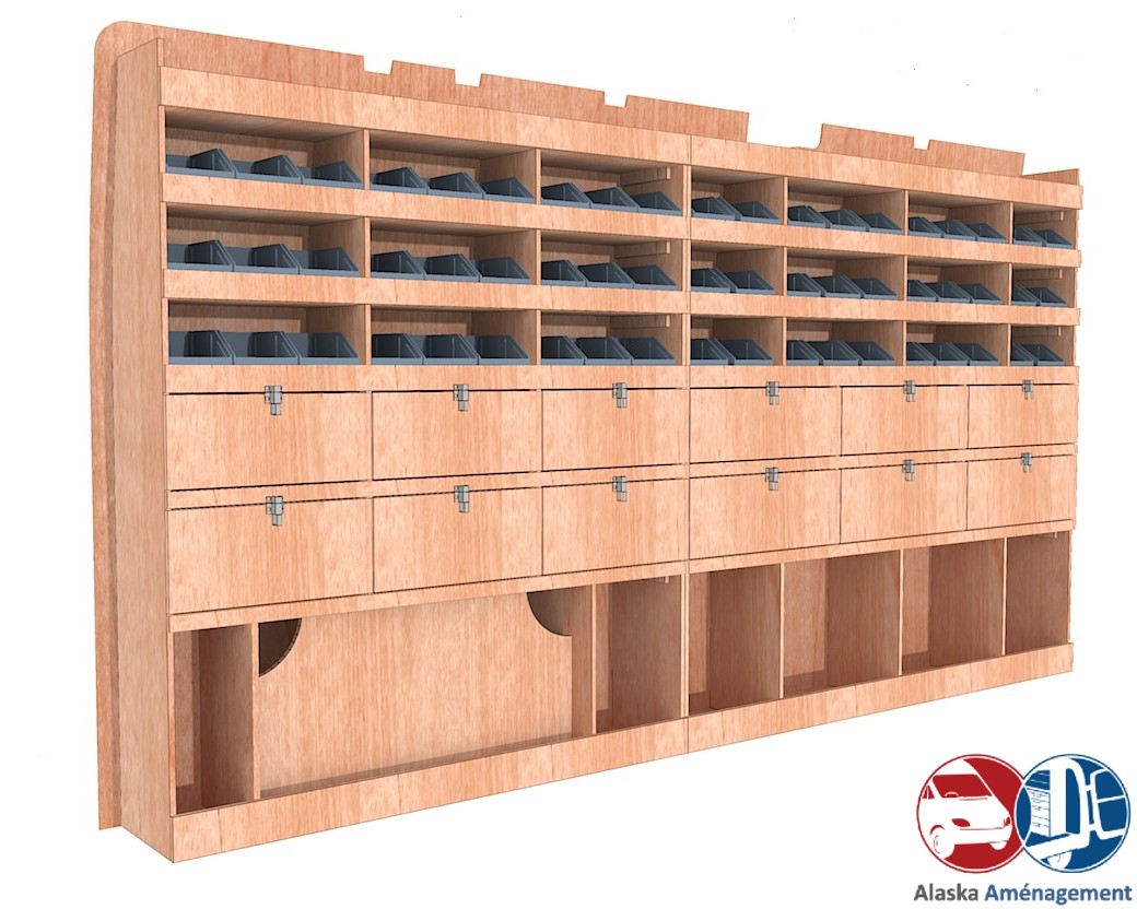 Ce meuble de rangement KRG002-N (pour le latéral « Gauche » de votre véhicule) offre une solution de stockage polyvalente et fonctionnelle avec sept niveaux de stockage. Il comprend des étagères pour bacs à bec et des clapets basculants. Une étagère supérieure est conçue pour les objets longs. Son fond arrière intégré assure la rigidité et protège la carrosserie du véhicule, évitant un habillage supplémentaire. Le meuble est disponible en contreplaqué brut ou filmé. |