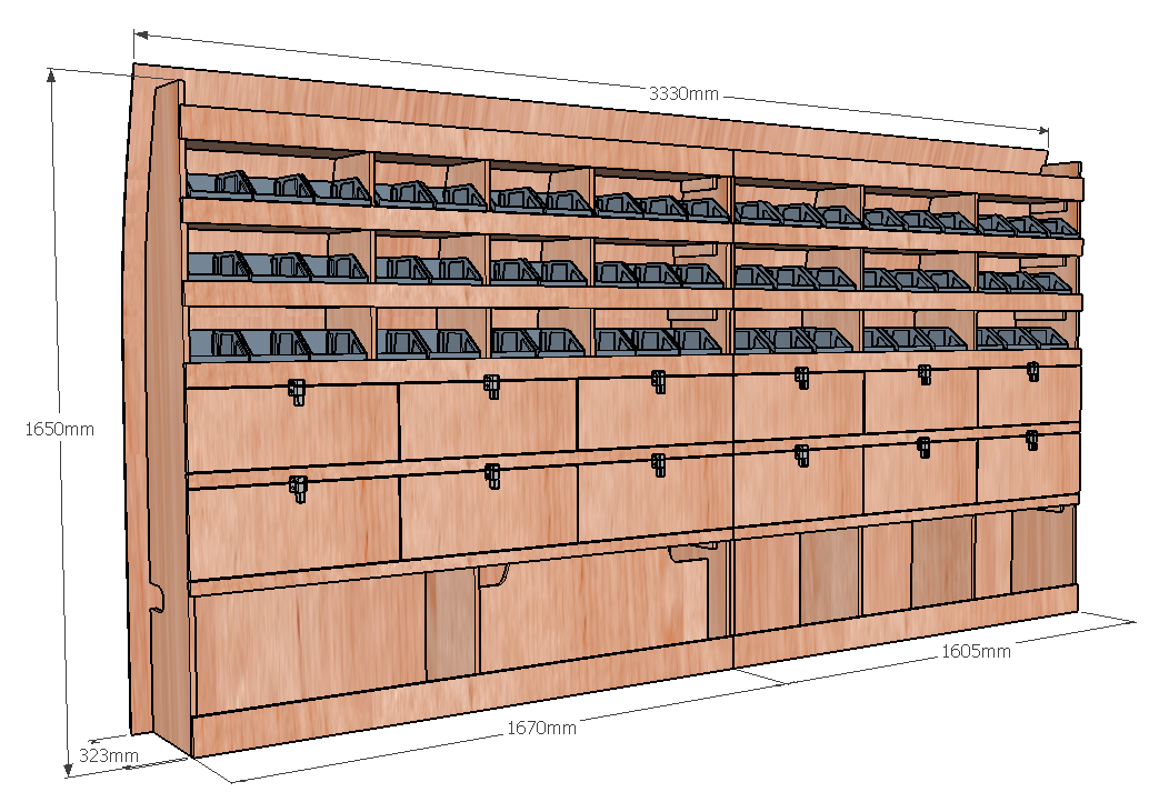 Ce meuble de rangement KRG002-N (pour le latéral « Gauche » de votre véhicule) offre une solution de stockage polyvalente et fonctionnelle avec sept niveaux de stockage. Il comprend des étagères pour bacs à bec et des clapets basculants. Une étagère supérieure est conçue pour les objets longs. Son fond arrière intégré assure la rigidité et protège la carrosserie du véhicule, évitant un habillage supplémentaire. Le meuble est disponible en contreplaqué brut ou filmé. |