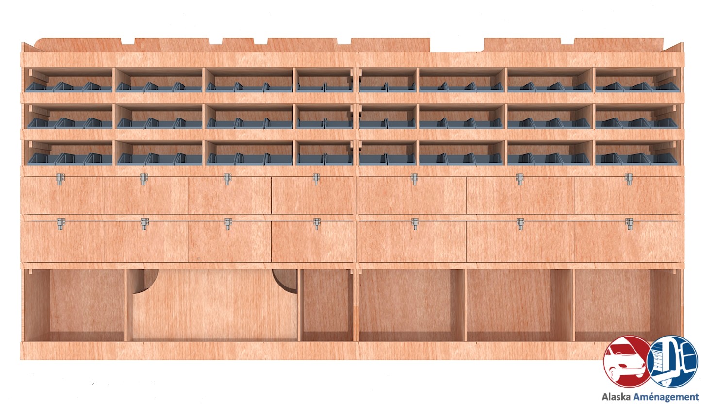 Ce meuble de rangement KRG002-N (pour le latéral « Gauche » de votre véhicule) offre une solution de stockage polyvalente et fonctionnelle avec sept niveaux de stockage. Il comprend des étagères pour bacs à bec et des clapets basculants. Une étagère supérieure est conçue pour les objets longs. Son fond arrière intégré assure la rigidité et protège la carrosserie du véhicule, évitant un habillage supplémentaire. Le meuble est disponible en contreplaqué brut ou filmé.