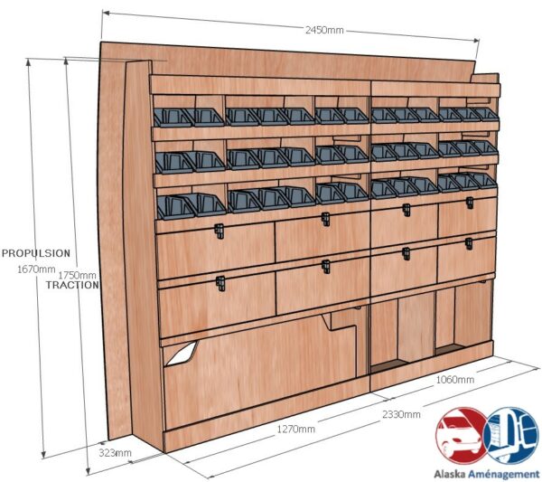 Ce meuble de rangement KRG002-N (pour le latéral « Gauche » de votre véhicule) offre une solution de stockage polyvalente et fonctionnelle avec sept niveaux de stockage. Il comprend des étagères pour bacs à bec et des clapets basculants. Une étagère supérieure est conçue pour les objets longs. Son fond arrière intégré assure la rigidité et protège la carrosserie du véhicule, évitant un habillage supplémentaire. Le meuble est disponible en contreplaqué brut ou filmé. |