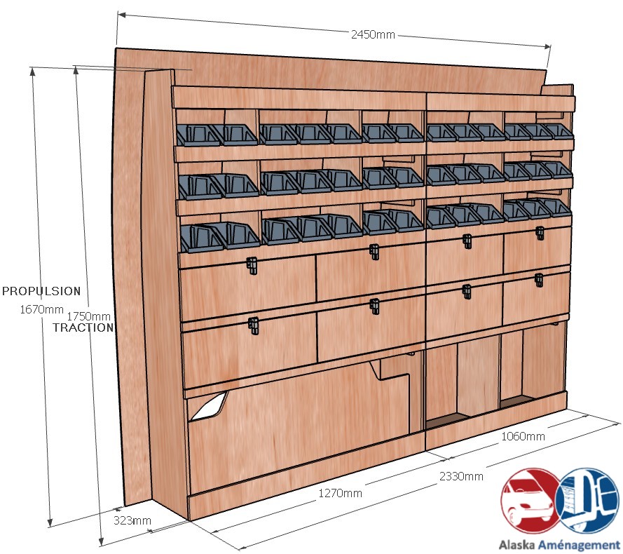 Ce meuble de rangement KRG002-N (pour le latéral « Gauche » de votre véhicule) offre une solution de stockage polyvalente et fonctionnelle avec sept niveaux de stockage. Il comprend des étagères pour bacs à bec et des clapets basculants. Une étagère supérieure est conçue pour les objets longs. Son fond arrière intégré assure la rigidité et protège la carrosserie du véhicule, évitant un habillage supplémentaire. Le meuble est disponible en contreplaqué brut ou filmé. |
