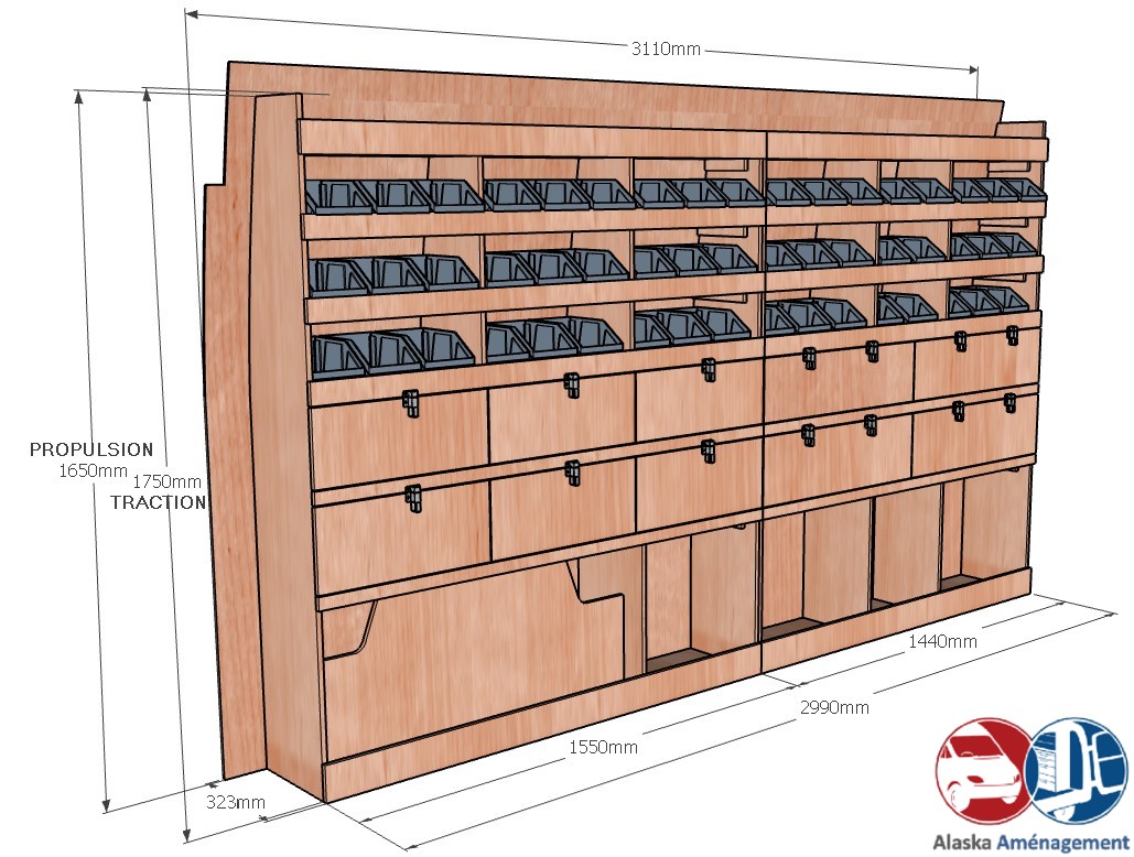 Ce meuble de rangement KRG002-N (pour le latéral « Gauche » de votre véhicule) offre une solution de stockage polyvalente et fonctionnelle avec sept niveaux de stockage. Il comprend des étagères pour bacs à bec et des clapets basculants. Une étagère supérieure est conçue pour les objets longs. Son fond arrière intégré assure la rigidité et protège la carrosserie du véhicule, évitant un habillage supplémentaire. Le meuble est disponible en contreplaqué brut ou filmé. |