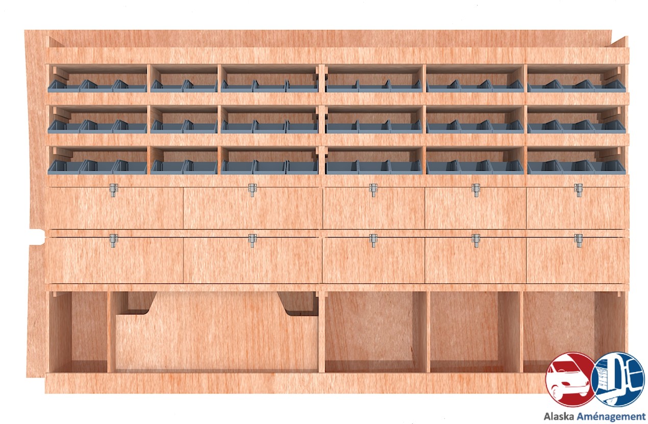 Ce meuble de rangement KRG002-N (pour le latéral « Gauche » de votre véhicule) offre une solution de stockage polyvalente et fonctionnelle avec sept niveaux de stockage. Il comprend des étagères pour bacs à bec et des clapets basculants. Une étagère supérieure est conçue pour les objets longs. Son fond arrière intégré assure la rigidité et protège la carrosserie du véhicule, évitant un habillage supplémentaire. Le meuble est disponible en contreplaqué brut ou filmé. |