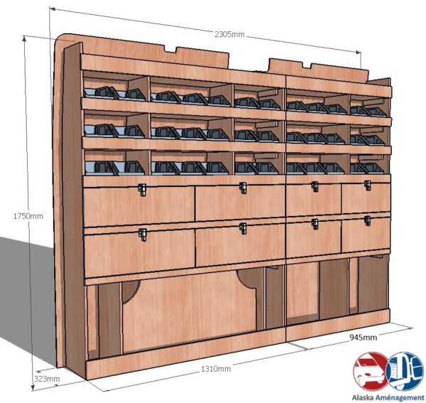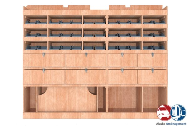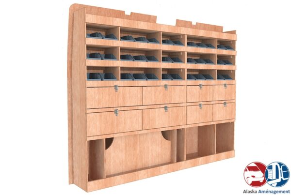 Ce meuble de rangement KRG002-N (pour le latéral « Gauche » de votre véhicule) offre une solution de stockage polyvalente et fonctionnelle avec sept niveaux de stockage. Il comprend des étagères pour bacs à bec et des clapets basculants. Une étagère supérieure est conçue pour les objets longs. Son fond arrière intégré assure la rigidité et protège la carrosserie du véhicule, évitant un habillage supplémentaire. Le meuble est disponible en contreplaqué brut ou filmé. |