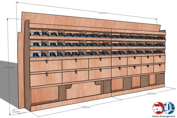 Ce meuble de rangement KRG002-N (pour le latéral « Gauche » de votre véhicule) offre une solution de stockage polyvalente et fonctionnelle avec sept niveaux de stockage. Il comprend des étagères pour bacs à bec et des clapets basculants. Une étagère supérieure est conçue pour les objets longs. Son fond arrière intégré assure la rigidité et protège la carrosserie du véhicule, évitant un habillage supplémentaire. Le meuble est disponible en contreplaqué brut ou filmé. |