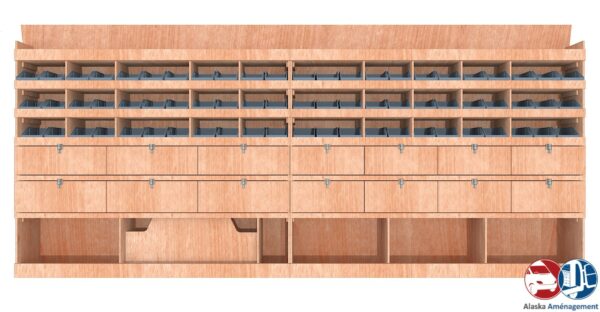 Ce meuble de rangement KRG002-N (pour le latéral « Gauche » de votre véhicule) offre une solution de stockage polyvalente et fonctionnelle avec sept niveaux de stockage. Il comprend des étagères pour bacs à bec et des clapets basculants. Une étagère supérieure est conçue pour les objets longs. Son fond arrière intégré assure la rigidité et protège la carrosserie du véhicule, évitant un habillage supplémentaire. Le meuble est disponible en contreplaqué brut ou filmé. |