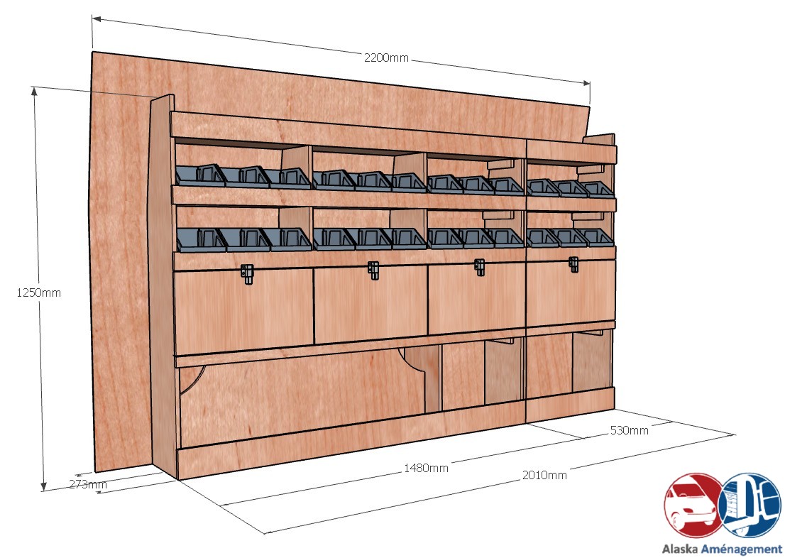 Ce meuble de rangement KRG002-N (pour le latéral « Gauche » de votre véhicule) offre une solution de stockage polyvalente et fonctionnelle avec cinq niveaux de stockage. Il comprend des étagères pour bacs à bec et des clapets basculants. Une étagère supérieure est conçue pour les objets longs. Son fond arrière intégré assure la rigidité et protège la carrosserie du véhicule, évitant un habillage supplémentaire. Le meuble est disponible en contreplaqué brut ou filmé. |