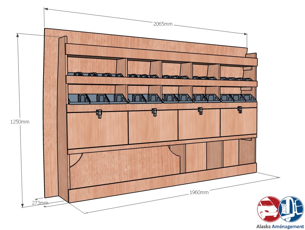 Ce meuble de rangement KRG002-N (pour le latéral « Gauche » de votre véhicule) offre une solution de stockage polyvalente et fonctionnelle avec cinq niveaux de stockage. Il comprend des étagères pour bacs à bec et des clapets basculants. Une étagère supérieure est conçue pour les objets longs. Son fond arrière intégré assure la rigidité et protège la carrosserie du véhicule, évitant un habillage supplémentaire. Le meuble est disponible en contreplaqué brut ou filmé.