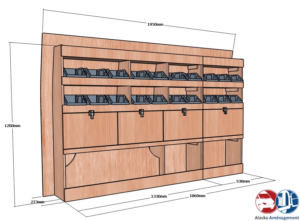 Ce meuble de rangement KRG002-N (pour le latéral « Gauche » de votre véhicule) offre une solution de stockage polyvalente et fonctionnelle avec cinq niveaux de stockage. Il comprend des étagères pour bacs à bec et des clapets basculants. Une étagère supérieure est conçue pour les objets longs. Son fond arrière intégré assure la rigidité et protège la carrosserie du véhicule, évitant un habillage supplémentaire. Le meuble est disponible en contreplaqué brut ou filmé. |