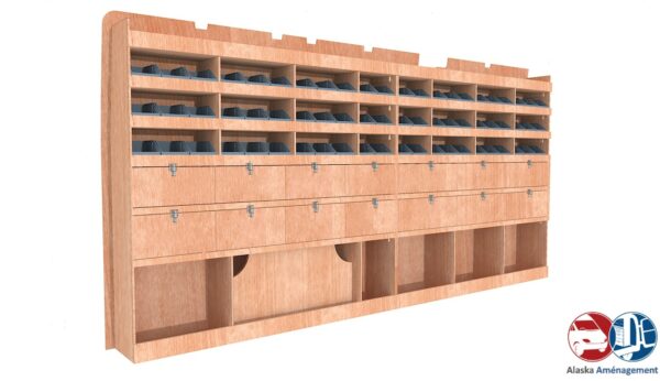 Ce meuble de rangement KRG002-N(pour le latéral « Gauche » de votre véhicule) offre une solution de stockage polyvalente et fonctionnelle avec sept niveaux de stockage. Il comprend des étagères pour bacs à bec et des clapets basculants. Une étagère supérieure est conçue pour les objets longs. Son fond arrière intégré assure la rigidité et protège la carrosserie du véhicule, évitant un habillage supplémentaire. Le meuble est disponible en contreplaqué brut ou filmé.