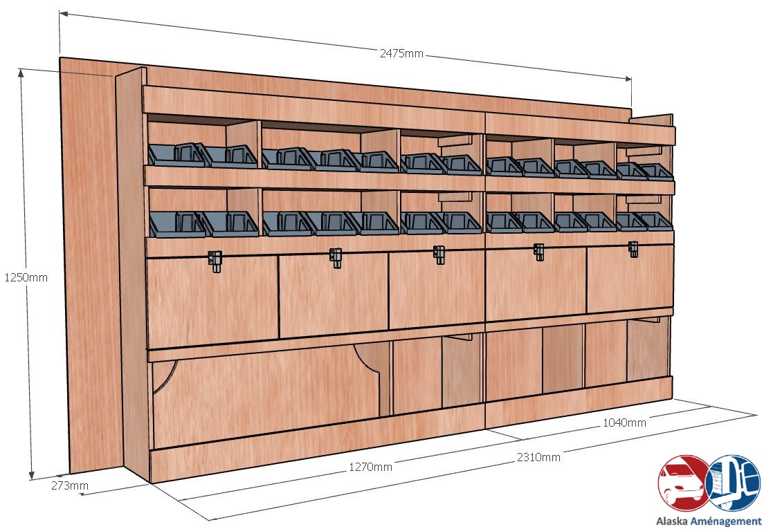 Ce meuble de rangement KRG002-N (pour le latéral « Gauche » de votre véhicule) offre une solution de stockage polyvalente et fonctionnelle avec cinq niveaux de stockage. Il comprend des étagères pour bacs à bec et des clapets basculants. Une étagère supérieure est conçue pour les objets longs. Son fond arrière intégré assure la rigidité et protège la carrosserie du véhicule, évitant un habillage supplémentaire. Le meuble est disponible en contreplaqué brut ou filmé.