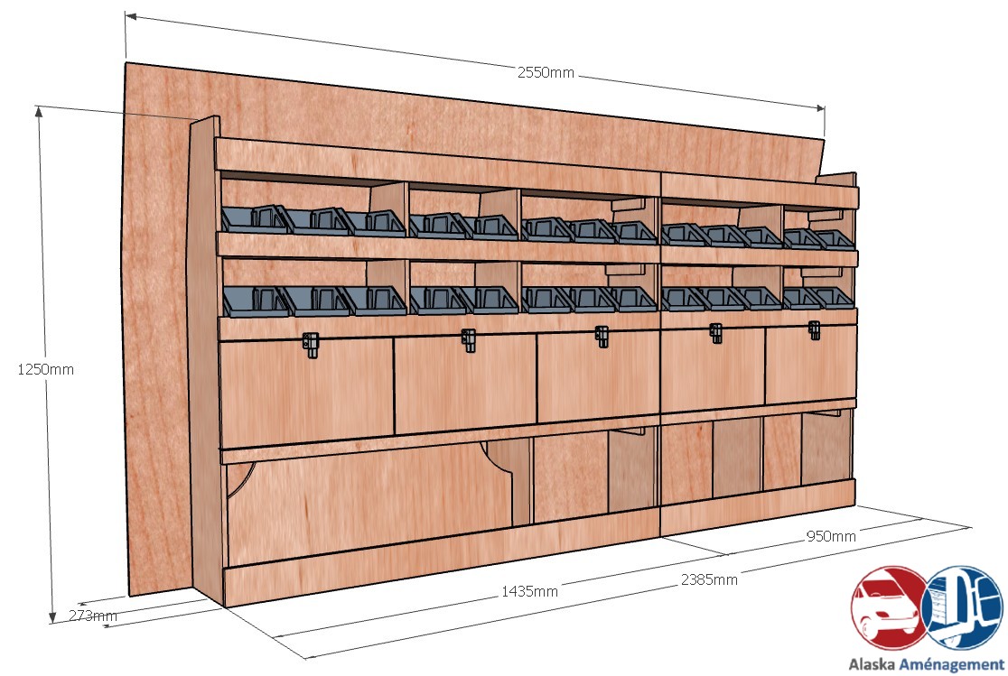 Ce meuble de rangement KRG002-N (pour le latéral « Gauche » de votre véhicule) offre une solution de stockage polyvalente et fonctionnelle avec cinq niveaux de stockage. Il comprend des étagères pour bacs à bec et des clapets basculants. Une étagère supérieure est conçue pour les objets longs. Son fond arrière intégré assure la rigidité et protège la carrosserie du véhicule, évitant un habillage supplémentaire. Le meuble est disponible en contreplaqué brut ou filmé. |