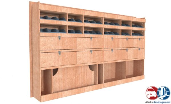 Ce meuble de rangement KRG002-N (pour le latéral « Gauche » de votre véhicule) offre une solution de stockage polyvalente et fonctionnelle avec six niveaux de stockage. Il comprend des étagères pour bacs à bec et des clapets basculants. Une étagère supérieure est conçue pour les objets longs. Son fond arrière intégré assure la rigidité et protège la carrosserie du véhicule, évitant un habillage supplémentaire. Le meuble est disponible en contreplaqué brut ou filmé.