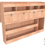 Ce meuble de rangement KRG002-N (pour le latéral « Gauche » de votre véhicule) offre une solution de stockage polyvalente et fonctionnelle avec cinq niveaux de stockage. Il comprend des clapets basculants. Une étagère supérieure est conçue pour les objets longs. Son fond arrière intégré assure la rigidité et protège la carrosserie du véhicule, évitant un habillage supplémentaire. Le meuble est disponible en contreplaqué brut ou filmé.