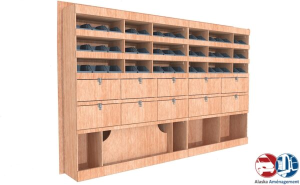 Ce meuble de rangement KRG002-N (pour le latéral « Gauche » de votre véhicule) offre une solution de stockage polyvalente et fonctionnelle avec sept niveaux de stockage. Il comprend des étagères pour bacs à bec et des clapets basculants. Une étagère supérieure est conçue pour les objets longs. Son fond arrière intégré assure la rigidité et protège la carrosserie du véhicule, évitant un habillage supplémentaire. Le meuble est disponible en contreplaqué brut ou filmé.