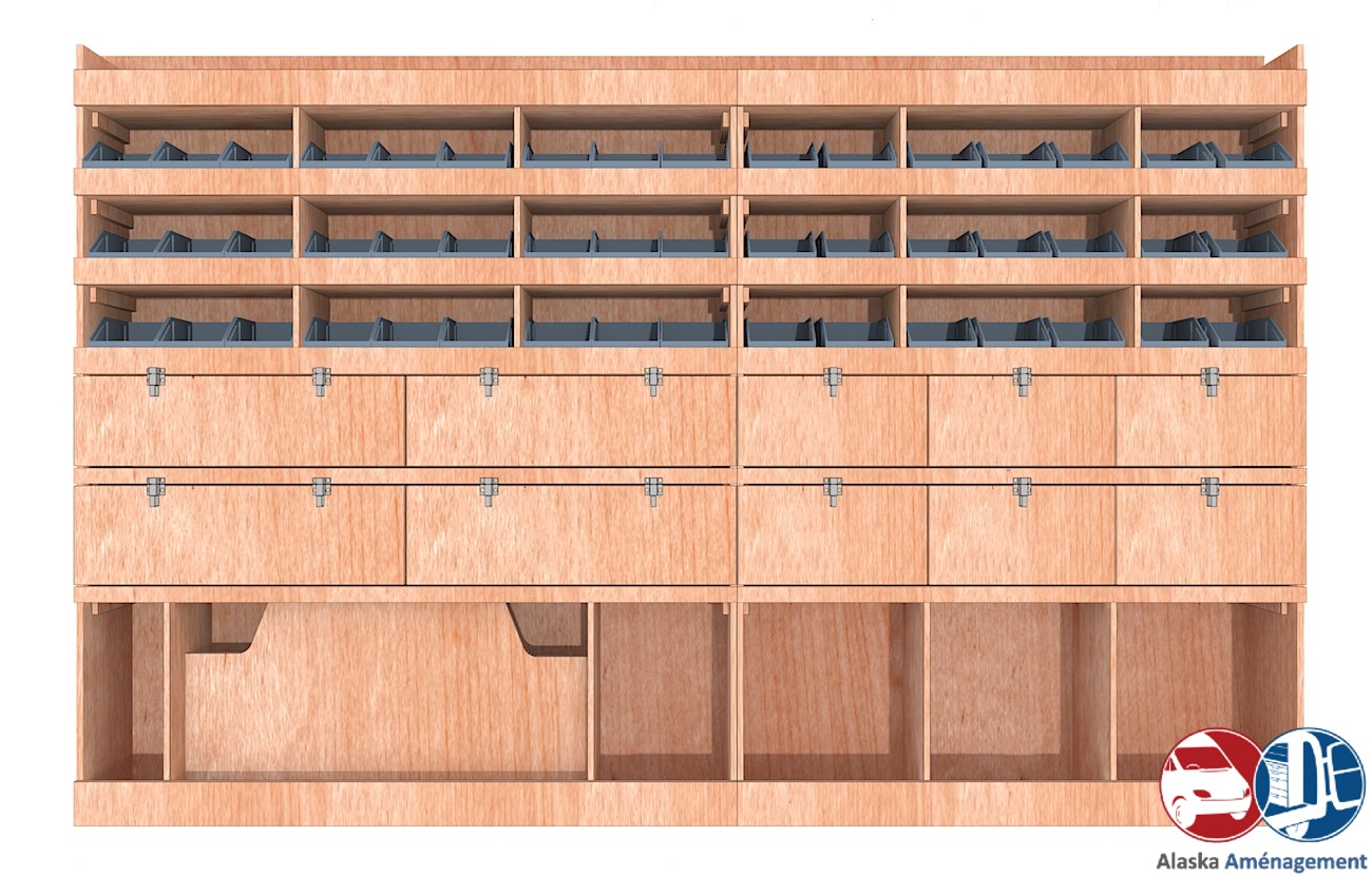 Ce meuble de rangement KRG002-N (pour le latéral « Gauche » de votre véhicule) offre une solution de stockage polyvalente et fonctionnelle avec sept niveaux de stockage. Il comprend des étagères pour bacs à bec et des clapets basculants. Une étagère supérieure est conçue pour les objets longs. Son fond arrière intégré assure la rigidité et protège la carrosserie du véhicule, évitant un habillage supplémentaire. Le meuble est disponible en contreplaqué brut ou filmé.