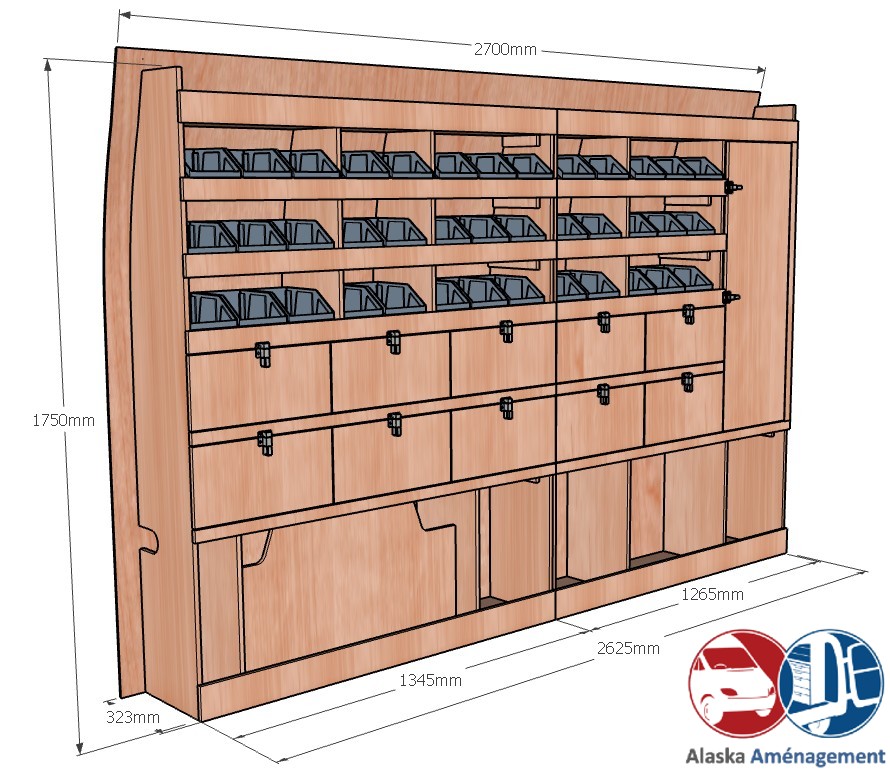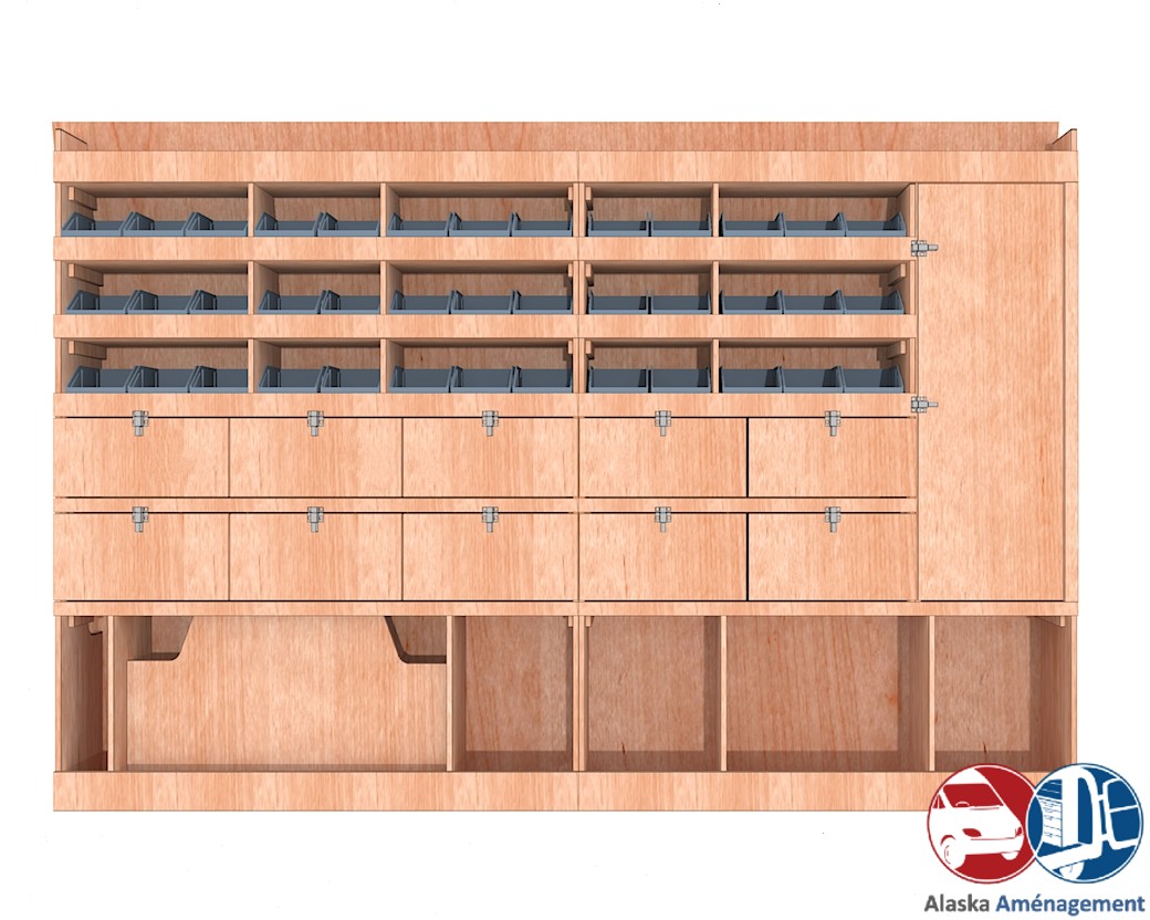Ce meuble de rangement KRG003-N (pour le latéral « Gauche » de votre véhicule) offre une solution polyvalente avec sept niveaux de stockage fonctionnels. Il comprend des étagères pour bacs à bec, des clapets basculants et un placard. Une étagère supérieure est conçue pour les objets longs. Son fond arrière intégré assure la rigidité et protège la carrosserie du véhicule, évitant un habillage supplémentaire. Le meuble est disponible en contreplaqué brut ou filmé. |