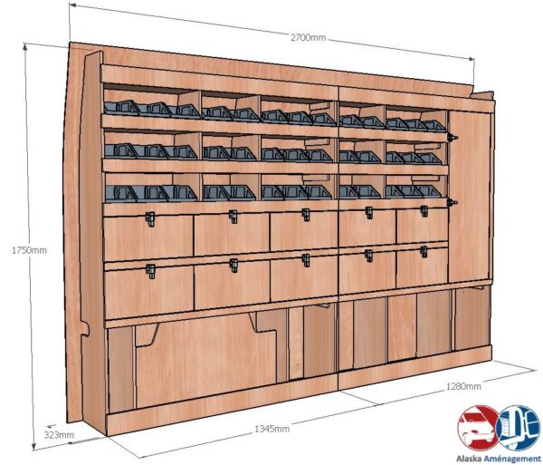 Ce meuble de rangement KRG003-N (pour le latéral « Gauche » de votre véhicule) offre une solution polyvalente avec sept niveaux de stockage fonctionnels. Il comprend des étagères pour bacs à bec, des clapets basculants et un placard. Une étagère supérieure est conçue pour les objets longs. Son fond arrière intégré assure la rigidité et protège la carrosserie du véhicule, évitant un habillage supplémentaire. Le meuble est disponible en contreplaqué brut ou filmé.