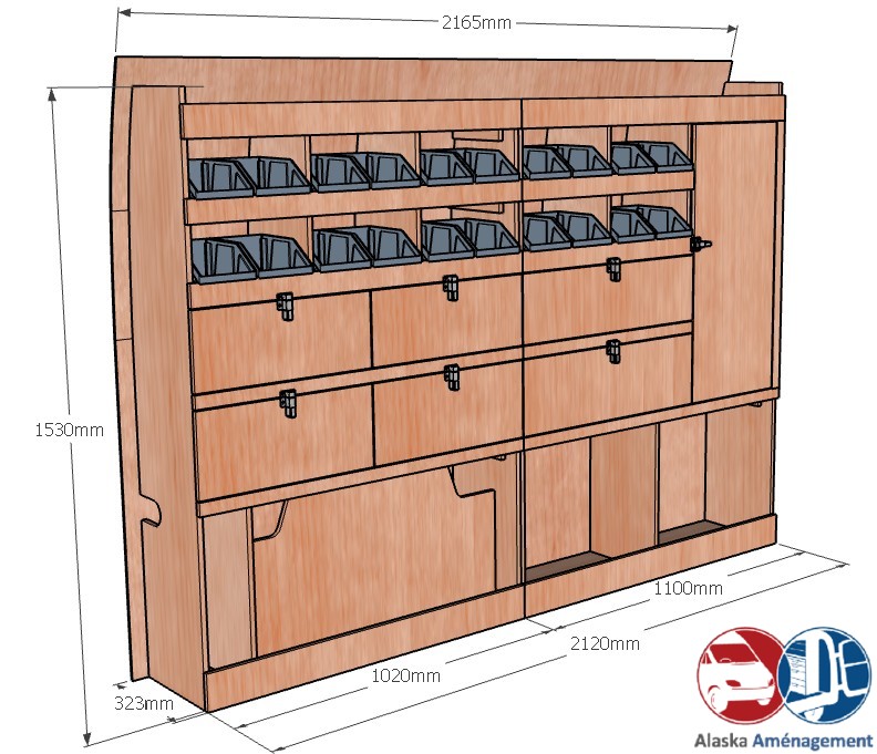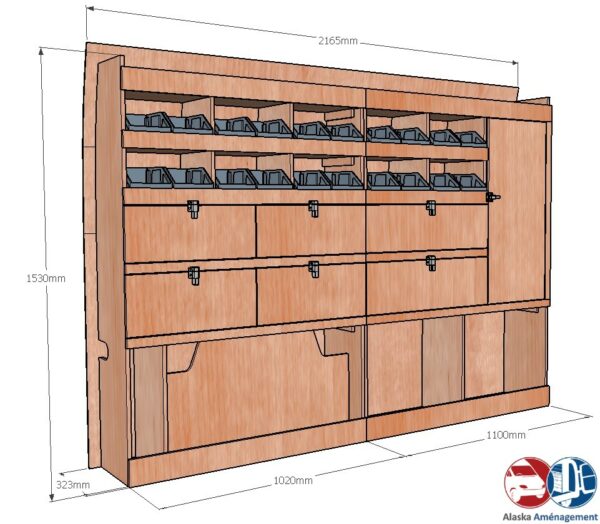 Ce meuble de rangement KRG003-N (pour le latéral « Gauche » de votre véhicule) offre une solution polyvalente avec six niveaux de stockage fonctionnels. Il comprend des étagères pour bacs à bec, des clapets basculants et un placard. Une étagère supérieure est conçue pour les objets longs. Son fond arrière intégré assure la rigidité et protège la carrosserie du véhicule, évitant un habillage supplémentaire. Le meuble est disponible en contreplaqué brut ou filmé.