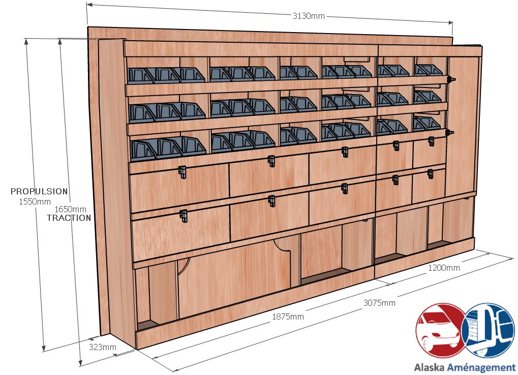 Ce meuble de rangement KRG003-N (pour le latéral « Gauche » de votre véhicule) offre une solution polyvalente avec sept niveaux de stockage fonctionnels. Il comprend des étagères pour bacs à bec, des clapets basculants et un placard. Une étagère supérieure est conçue pour les objets longs. Son fond arrière intégré assure la rigidité et protège la carrosserie du véhicule, évitant un habillage supplémentaire. Le meuble est disponible en contreplaqué brut ou filmé. |