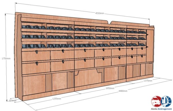 Ce meuble de rangement KRG003-N(pour le latéral « Gauche » de votre véhicule) offre une solution polyvalente avec sept niveaux de stockage fonctionnels. Il comprend des étagères pour bacs à bec, des clapets basculants et un placard. Une étagère supérieure est conçue pour les objets longs. Son fond arrière intégré assure la rigidité et protège la carrosserie du véhicule, évitant un habillage supplémentaire. Le meuble est disponible en contreplaqué brut ou filmé.