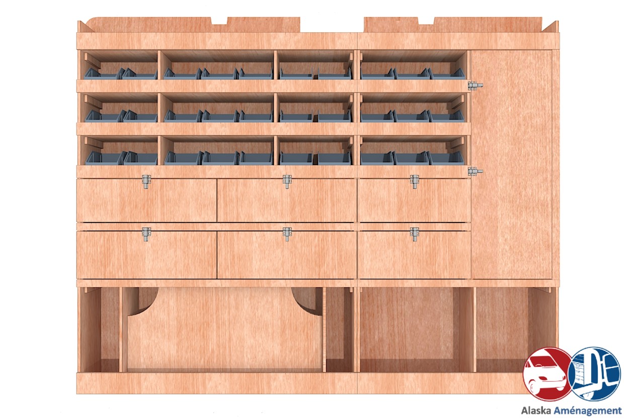 Ce meuble de rangement KRG003-N (pour le latéral « Gauche » de votre véhicule) offre une solution polyvalente avec sept niveaux de stockage fonctionnels. Il comprend des étagères pour bacs à bec, des clapets basculants et un placard. Une étagère supérieure est conçue pour les objets longs. Son fond arrière intégré assure la rigidité et protège la carrosserie du véhicule, évitant un habillage supplémentaire. Le meuble est disponible en contreplaqué brut ou filmé.