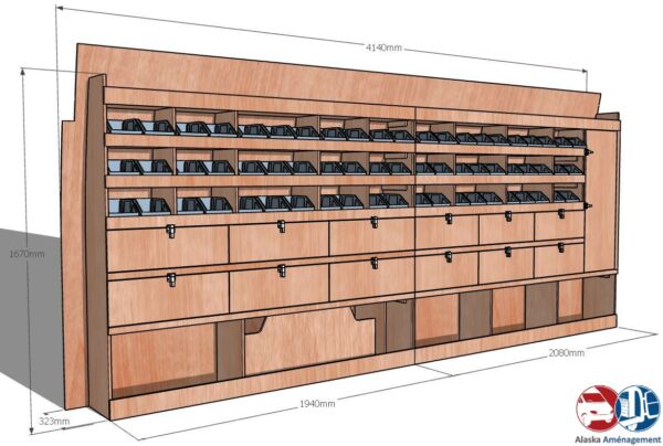 Ce meuble de rangement KRG003-N (pour le latéral « Gauche » de votre véhicule) offre une solution polyvalente avec sept niveaux de stockage fonctionnels. Il comprend des étagères pour bacs à bec, des clapets basculants et un placard. Une étagère supérieure est conçue pour les objets longs. Son fond arrière intégré assure la rigidité et protège la carrosserie du véhicule, évitant un habillage supplémentaire. Le meuble est disponible en contreplaqué brut ou filmé. |
