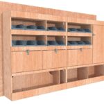 Ce meuble de rangement KRG003-N (pour le latéral « Gauche » de votre véhicule) offre une solution polyvalente avec cinq niveaux de stockage fonctionnels. Il comprend des étagères pour bacs à bec, des clapets basculants et un placard. Une étagère supérieure est conçue pour les objets longs. Son fond arrière intégré assure la rigidité et protège la carrosserie du véhicule, évitant un habillage supplémentaire. Le meuble est disponible en contreplaqué brut ou filmé.